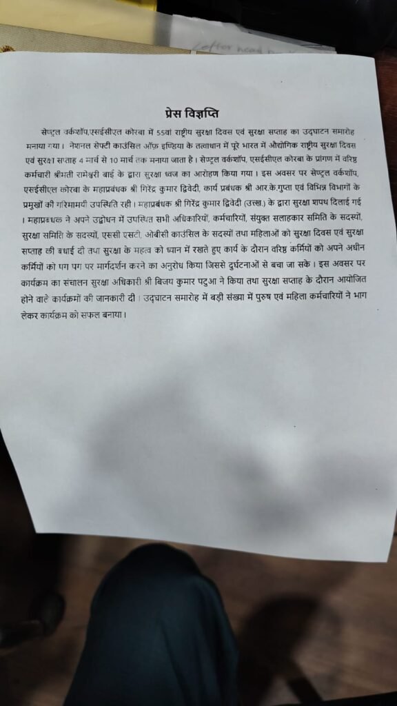 कोरबा। छत्तीसगढ़ के Korba स्थित South Eastern Coalfields Limited (एसईसीएल) के सेंट्रल वर्कशॉप परिसर में 55वां राष्ट्रीय सुरक्षा दिवस एवं सुरक्षा सप्ताह का उद्घाटन समारोह आयोजित किया गया। यह कार्यक्रम National Safety Council of India के तत्वावधान में मनाया गया।