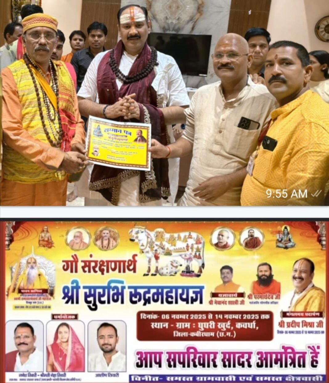 कवर्धा (छत्तीसगढ़):कवर्धा में आयोजित भव्य कार्यक्रम में जांजगीर के प्रसिद्ध ज्योतिषाचार्य राजेंद्र शर्मा जी को “विप्र गौरव सम्मान” से सम्मानित किया गया। यह सम्मान गणेश तिवारी जी के द्वारा आयोजित कार्यक्रम में प्रदान किया गया। इस अवसर पर पंडित प्रदीप मिश्रा द्वारा आयोजित महाआरती में भी राजेंद्र शर्मा जी ने सहभागिता की। समारोह में विप्र समाज के अनेक गणमान्य लोग उपस्थित रहे और इस सम्मान पर हर्ष व्यक्त किया।