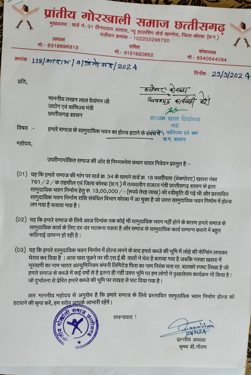 कोरबा। प्रांतीय गोरखाली समाज छत्तीसगढ़ के अध्यक्ष कृष्ण बी. गौतम ने उद्योग एवं वाणिज्य मंत्री लखन लाल देवांगन को पत्र लिखकर समाज के सामुदायिक भवन निर्माण पर लगे होल्ड को हटाने की मांग की है।