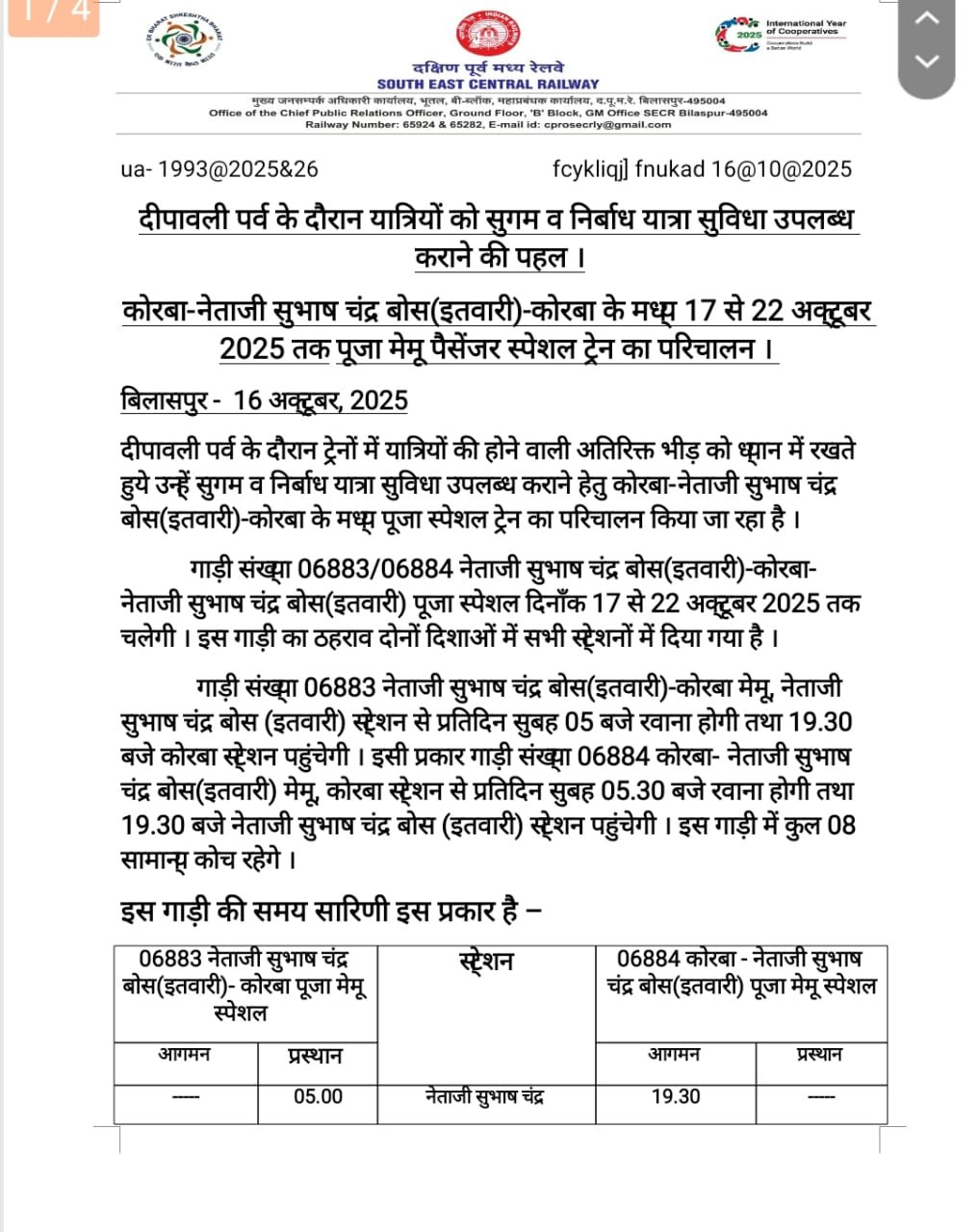 कोरबा, 18 अक्टूबर 2025। नागरिक जन सेवा समिति, कोरबा के अनुसार, भारतीय रेलवे ने त्यौहारी सीजन को देखते हुए महाप्रबंधक के निर्देश पर कोरबा वासियों के लिए रेलगाड़ी संख्या 06883-06884 दीपावली पूजा स्पेशल ट्रेन विशेष सुविधा के साथ चलाने का निर्णय लिया है।