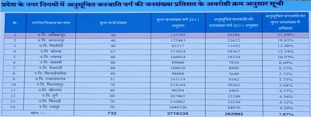 कोरबा के अलावा अन्य नगर निगमों के लिए आरक्षण इस प्रकार है: