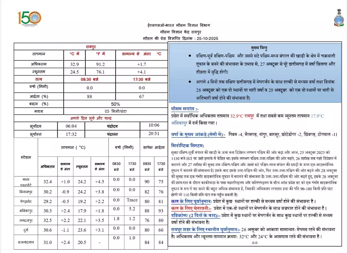 रायपुर। बंगाल की खाड़ी में बन रहे अवदाब ने मौसम का मिजाज बदल दिया है। मौसम विभाग के अनुसार, दक्षिण पूर्व बंगाल की खाड़ी के पास स्थित यह अवदाब उत्तर-पश्चिम दिशा में आगे बढ़ते हुए 26 अक्टूबर को गहरे अवदाब में और 27 अक्टूबर की सुबह चक्रवात में बदल सकता है।