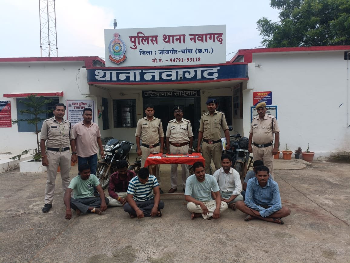 ⏩ श्रीमान विवेक शुक्ला (IPS) पुलिस अधीक्षक जांजगीर चांपा के निर्देशन में जिले में जुआ शराब पर अंकुश लाने के लिए जिला पुलिस जांजगीर द्वारा लगातार कार्यवाही करने के निर्देश पर अतिरिक्त पुलिस अधीक्षक श्री राजेंद्र कुमार जायसवाल के मार्गदर्शन में थाना नवागढ़ पुलिस द्वारा मुखबिर सूचना पर घर अंदर रुपए पैसे का दाव लगाकर जुआ खेलने वालो के विरूद्ध रेड कार्यवाही किया गया जिसमे आरोपी (01) रामसिंह पिता संत राम साहू उम्र 49 साल (02) रामसरकार पिता गुडालू उम्र 40 साल (03) जनीराम साहू पिता खोलबहरा उम्र 32 साल (04) जय कुमार साहू पिता खिखराम साहू उम्र 38 साल (05) हेमंत साहू पिता सहदेव साहू उम्र 22 साल (06) रामधन दिवाकर पिता सालिक राम दिवाकर उम्र 35 साल (07) धरमराज साहू पिता पतिराम साहू उम्र 32 साल सभी निवासी कटौद थाना नवागढ़ जिला जांजगीर चांपा को पकड़ा जिसके कब्जे से जुमला नगदी रकम 14,000/ रुपए, 06 नग मोबाइल, 04 नग मोटर सायकल जुमला किमती लगभग 02 लाख रूपये को बरामद कर आरोपियों के विरुद्ध अपराध क्रमाक 335/24 धारा 4,5 छ. ग. जुआ अधिनियम 2022 के विधिवत कार्यवाही कर न्यायालय पेश किया गया है ।