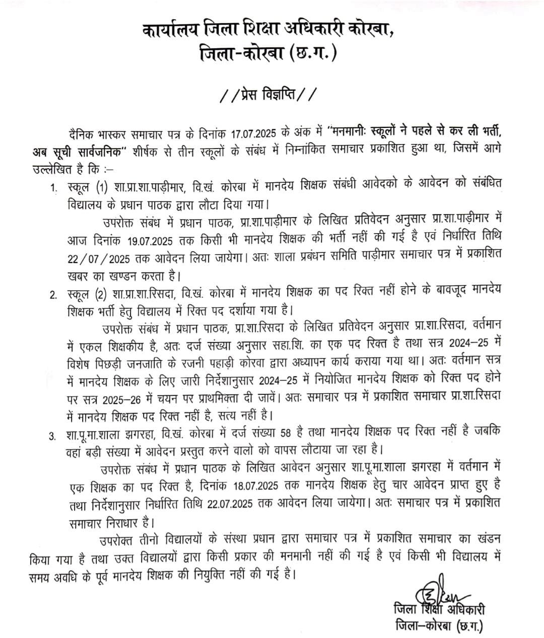 कोरबा, 19 जुलाई 2025। जिला शिक्षा अधिकारी कार्यालय, कोरबा द्वारा एक प्रेस विज्ञप्ति जारी कर दैनिक भास्कर समाचार पत्र के 17 जुलाई 2025 के अंक में प्रकाशित “मनमानीः स्कूलों ने पहले से कर ली भर्ती, अब सूची सार्वजनिक” शीर्षक खबर का खंडन किया गया है। उक्त खबर में कोरबा विकासखंड के तीन स्कूलों में कथित अनियमितताओं का उल्लेख किया गया था, जिस पर संबंधित विद्यालयों के प्रधान पाठकों द्वारा लिखित स्पष्टीकरण प्रस्तुत किया गया है।