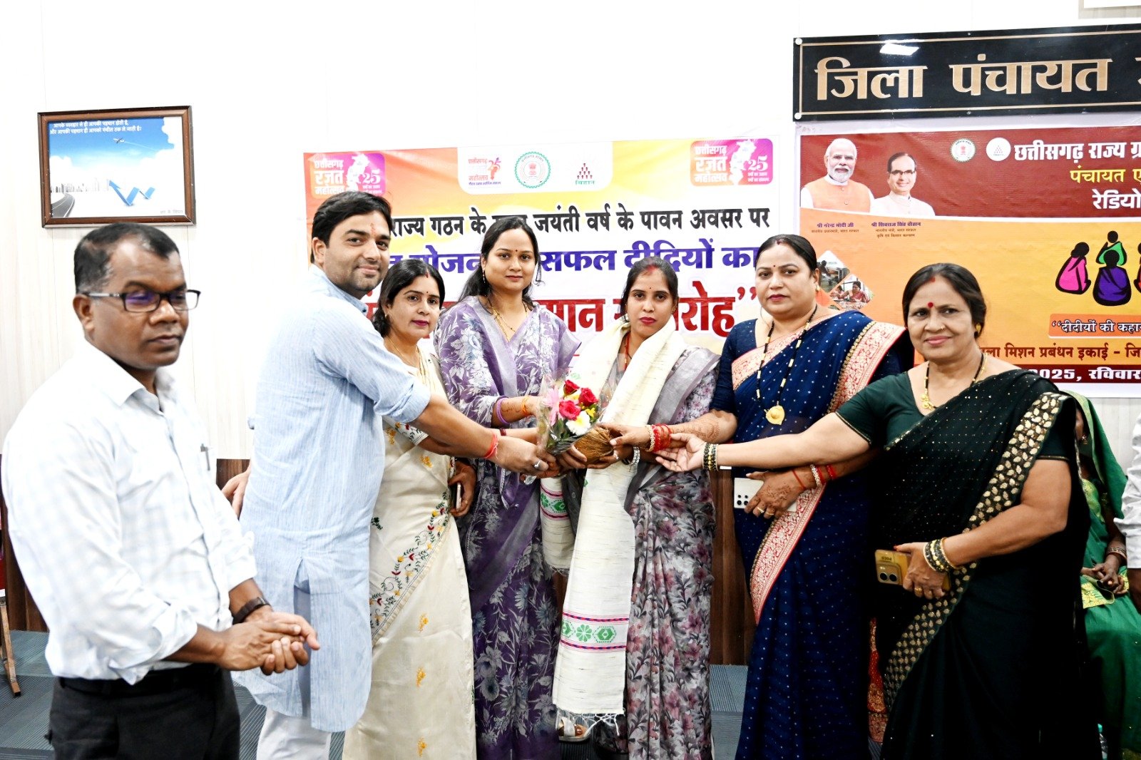 जांजगीर-चांपा 31 अगस्त 2025/ छत्तीसगढ़ राज्य गठन के रजत जयंती महोत्सव के अवसर पर जिला पंचायत सभाकक्ष में “बिहान योजना के सफल दीदियों का संवाद एवं सम्मान समारोह” आयोजित किया गया। जिला पंचायत अध्यक्ष श्रीमती सत्यलता आनंद मिरी सहित उपाध्यक्ष, सदस्यों ने समारोह में बिहान योजना के अंतर्गत उत्कृष्ट कार्य कर आत्मनिर्भरता की मिसाल बनने वाली दीदियों को साल एवं श्रीफल से सम्मानित किया गया। इस दौरान उपाध्यक्ष श्री गगन जयपुरिया, जिला पंचायत सभापति श्री राजकुमार साहू, श्रीमती प्रियंका सिंह, श्रीमती मोहन कुमारी साहू, जिला पंचायत सीईओ श्री गोकुल रावटे, उप संचालक पंचायत श्री अभिमन्यु साहू सहित अधिकारी-कर्मचारी एवं स्व-सहायता समूह की महिलाएं उपस्थित थीं।