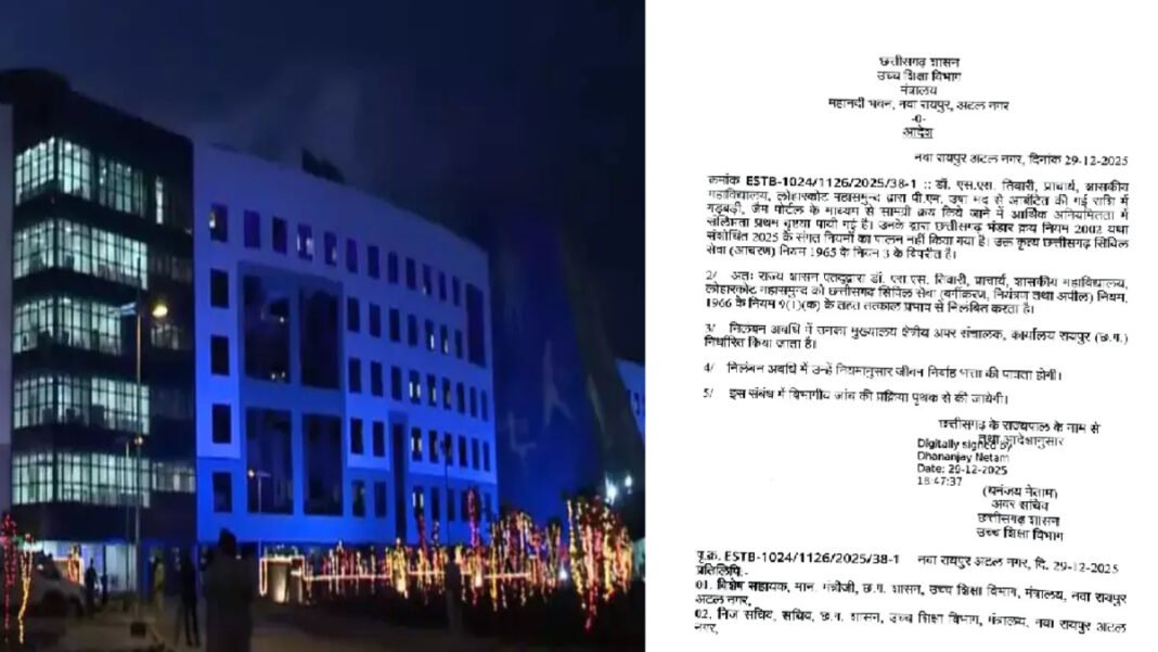 CG NEWS : रायपुर/महासमुंद: छत्तीसगढ़ के शिक्षा विभाग में भ्रष्टाचार और आर्थिक अनियमितता के खिलाफ राज्य सरकार ने कड़ा रुख अपनाया है। महासमुंद जिले के लोहारकोट और पिथौरा महाविद्यालयों में ‘पीएम उषा’ (PM-USHA) योजना की राशि में बड़े पैमाने पर गड़बड़ी पाए जाने के बाद एक प्राचार्य और चार सहायक प्राध्यापकों (Assistant Professors) को तत्काल प्रभाव से निलंबित कर दिया गया है।