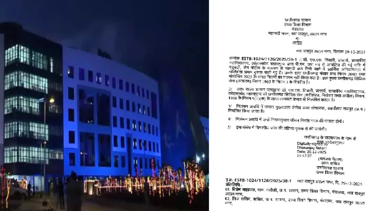 प्राचार्य ने ताक पर रखे नियम पहली और मुख्य कार्रवाई शासकीय महाविद्यालय लोहारकोट में हुई है। यहाँ के प्राचार्य डॉ. एस.एस. तिवारी पर आरोप है कि उन्होंने पीएम उषा मद से आवंटित राशि के उपयोग में भारी लापरवाही बरती। जांच में पाया गया कि जैम (GeM) पोर्टल के माध्यम से सामग्री खरीदने में आर्थिक अनियमितता की गई और छत्तीसगढ़ भंडार क्रय नियम 2002 (संशोधित 2025) का पालन नहीं किया गया। उनका यह कृत्य सिविल सेवा आचरण नियम के विरुद्ध माना गया है।