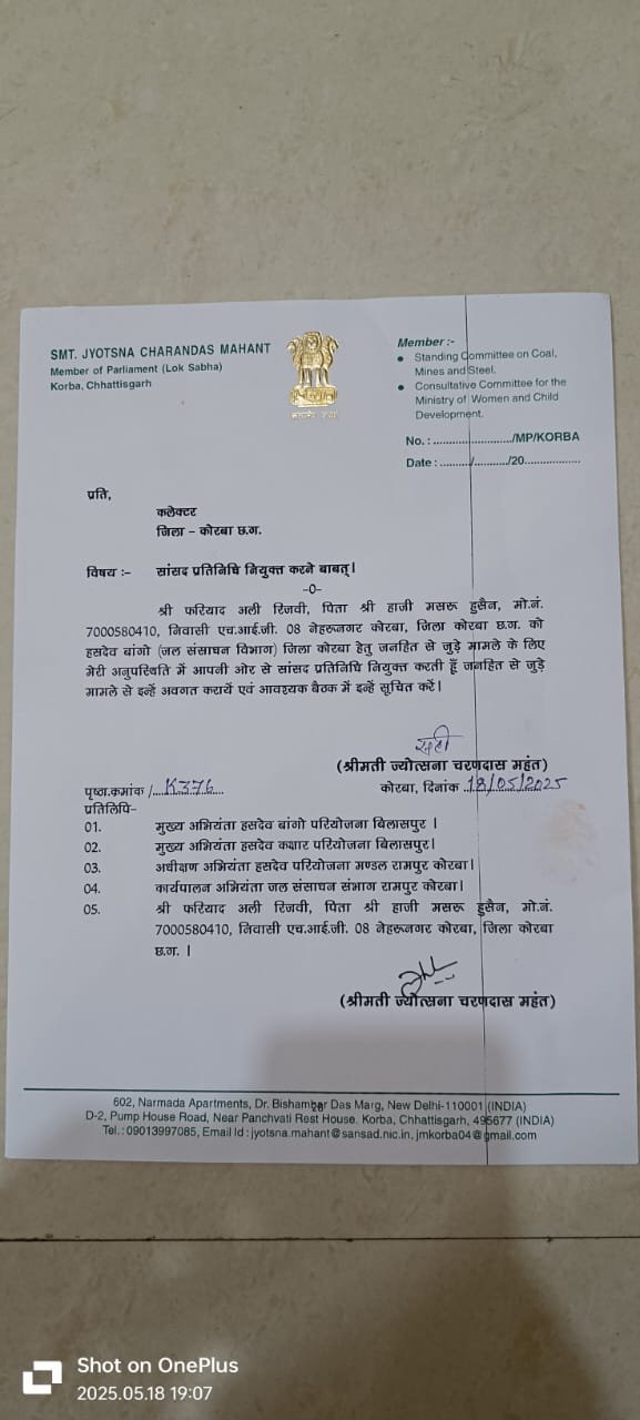 कोरबा, 18 मई 2025 — कोरबा लोकसभा क्षेत्र की सांसद श्रीमती ज्योत्सना चरणदास महंत ने जनहित से जुड़े मामलों के संचालन और समन्वय के लिए श्री फरियाद अली रिज़वी को हसदेव बांगो परियोजना (जल संसाधन विभाग), जिला कोरबा हेतु अपना अधिकृत सांसद प्रतिनिधि नियुक्त किया है।