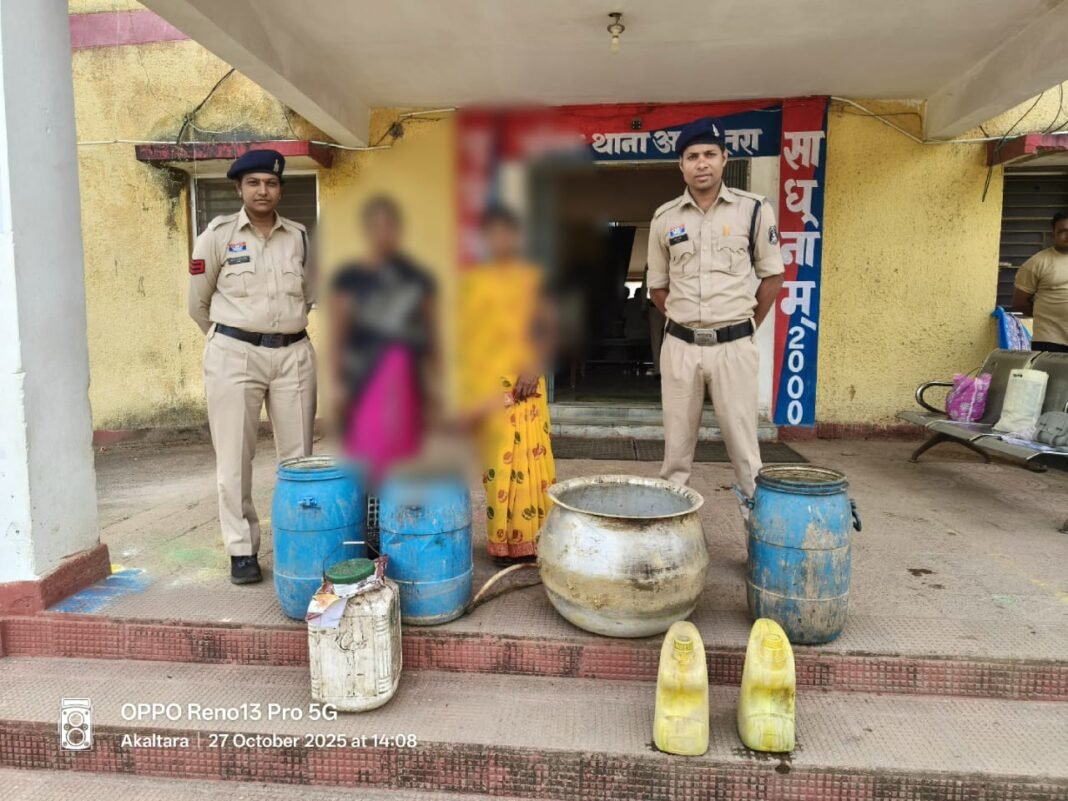 श्री विजय कुमार पाण्डेय (IPS) पुलिस अधीक्षक जांजगीर चांपा के निर्देशन में जिले में अवैध शराब बिक्री पर अंकुश लाने के लिए जिला पुलिस जांजगीर द्वारा लगातार कार्रवाई की जा रही है इसी क्रम में थाना अकलतरा पुलिस द्वारा अवैध शराब बिक्री करने वालों के विरुद्ध कार्यवाही किया गया जिसमें महिला आरोपी हेमलता राही निवासी स्टेशन पारा कोटमीसोनार के कब्जे से 8 लीटर कच्ची महुआ शराब एवं शिवकुमारी भारद्वाज निवासी बरगवां थाना अकलतरा के कब्जे से 6 लीटर कच्ची महुआ शराब जुमला शराब कीमती 2800/₹ बरामद किया जाकर विधिवत आबकारी एक्ट के तहत कार्यवाही करते हुए न्यायिक रिमांड पर भेजा जा चुका है।
