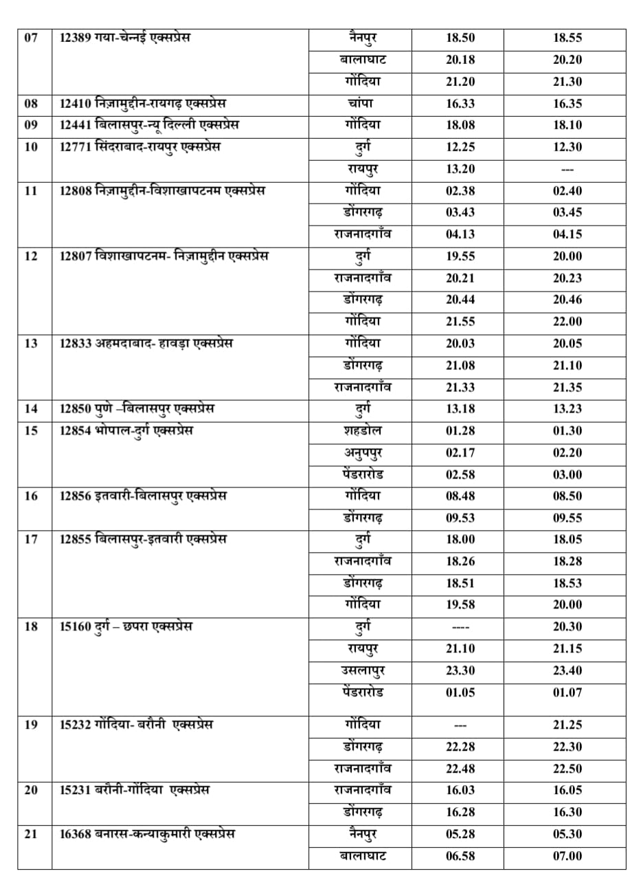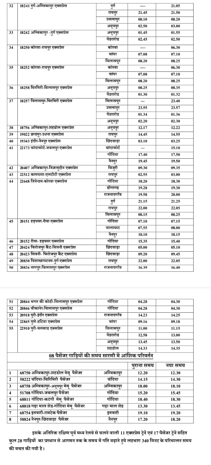 दक्षिण पूर्व मध्य रेलवे ने बताया कि हर वर्ष विभिन्न रेलवे स्टेशनों और सेक्शनों में इंफ्रास्ट्रक्चर डेवलपमेंट का कार्य चलता रहता है। इन्हीं कार्यों के चलते ट्रेनों की गति और परिचालन समय में सुधार किया जाता है। इसी प्रक्रिया के तहत हर साल 1 जनवरी से नई समय-सारणी लागू की जाती है। वर्ष 2026 में भी इसी क्रम में आंशिक परिवर्तन किया गया है।