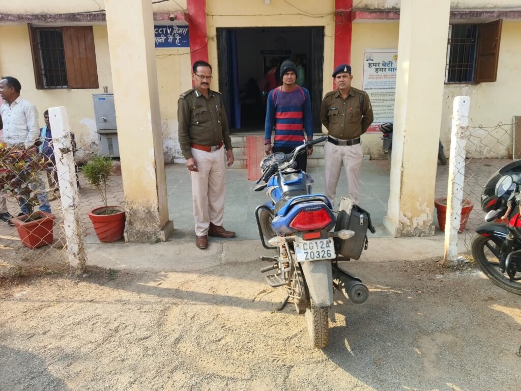 ⏩ विवेचना दौरान अज्ञात आरोपी एवम मोटर सायकल की पतासाजी की जा रही थी कि जरिये मुखबिर सूचना मिला की आरोपी मोनू उर्फ कन्हैया कश्यप निवासी चंडीपारा थाना पामगढ़ का उक्त चोरी गए मो0सा0 से शराब भट्ठी आया हुआ है की सूचना पर उक्त आरोपी को चोरी हुए मोटर सायकल के साथ घेरा बंदी कर पकड़ा हिरासत में लेकर पूछताछ कर मेमोरंडम कथन लिया जो घटना दिनांक को अपने एक अन्य साथी के साथ उक्त मो0सा0 को चोरी करना स्वीकार किया जो समक्ष गवाहों के उक्त चोरी हुए मोटर सायकल को बरामद किया जाकर आरोपी को विधिवत् गिरफ्तार कर दिनांक 17.01.2025 को न्यायिक रिमाण्ड पर भेजा गया है। मामले में एक अन्य आरोपी फरार है जिसकी पतासाजी जारी है।