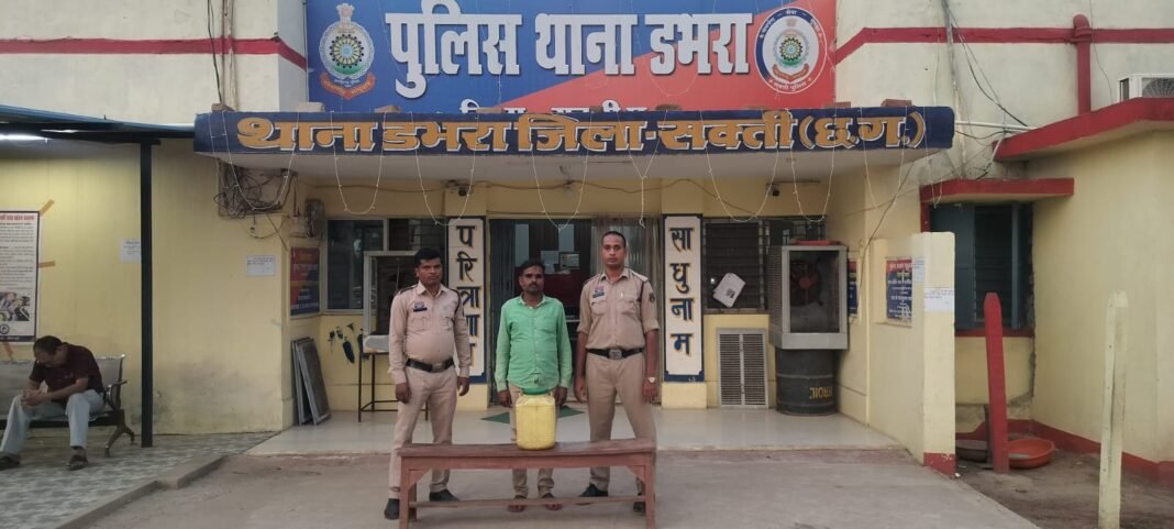 थाना डभरा जिला सक्ती अपराध क्रमांक 124/2025 धारा 34 (2) आबकारी एक्ट 15 लीटर कच्ची महुआ शराब के साथ आरोपी गिरफ्तार डभरा पुलिस की कार्यवाही