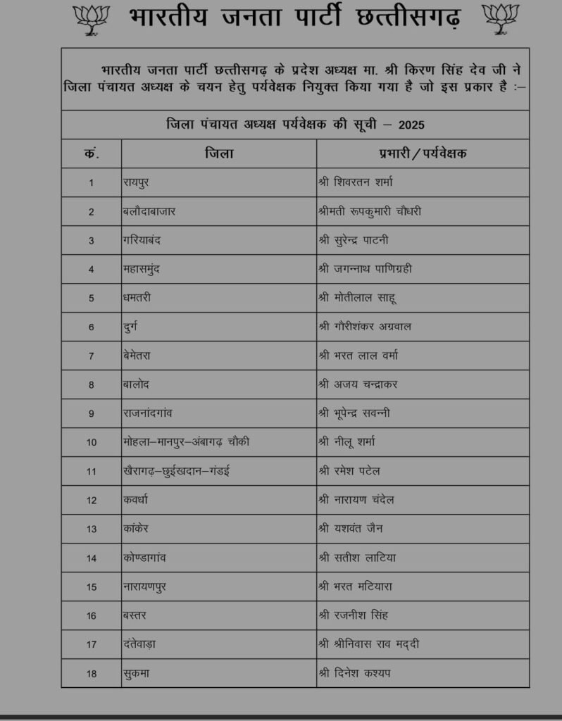रायपुर। भारतीय जनता पार्टी, छत्तीसगढ़ के प्रदेश अध्यक्ष श्री किरण सिंह देव जी ने जिला पंचायत अध्यक्षों के चयन हेतु पर्यवेक्षक नियुक्त किए हैं। यह निर्णय संगठन की मजबूती और जिला पंचायतों में समुचित नेतृत्व चयन को सुनिश्चित करने के लिए लिया गया है।
