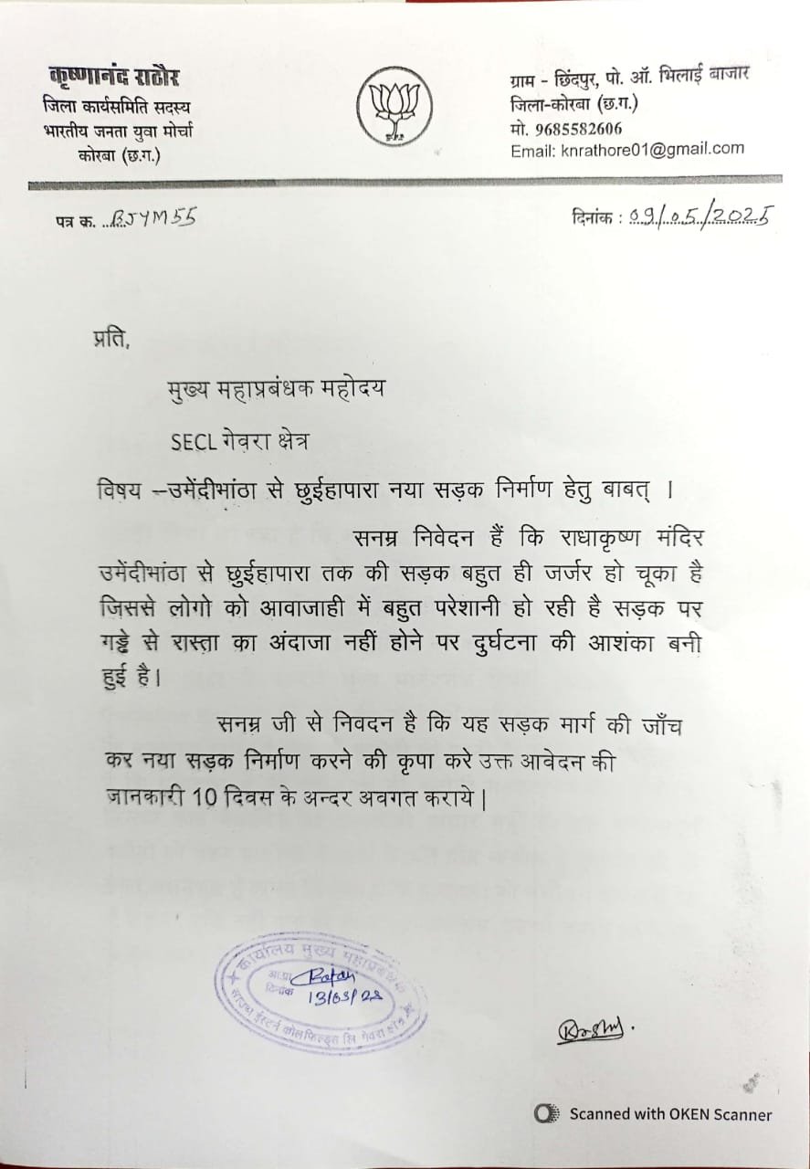 उमेंदीभांठा से छुईहापारा सड़क निर्माण के लिए कोरबा कलेक्टर व एसईसीएल गेवरा महाप्रबंधक को भाजपा युवा मोर्चा कार्यसमिति के सदस्य कृष्णानंद राठौर ने पत्र लिखकर कराया अवगत