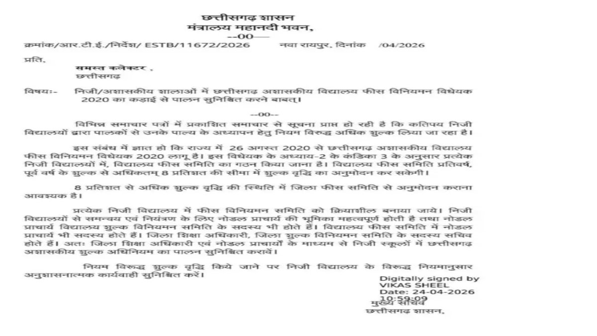 इस निर्देश का मुख्य उद्देश्य राज्य में लागू “छत्तीसगढ़ अशासकीय विद्यालय फीस विनियमन विधेयक, 2020” का सख्ती से क्रियान्वयन सुनिश्चित करना है, ताकि अभिभावकों को आर्थिक बोझ से राहत मिल सके।