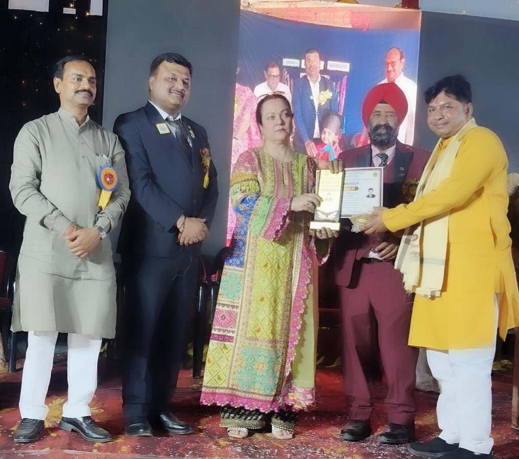 फ़ोटो- लायन डॉ.नागेन्द्र नारायण शर्मा को लायंस गौरव सम्मान से सम्मानित करती मंदाकिनी एवं अन्य अतिथिगण ।