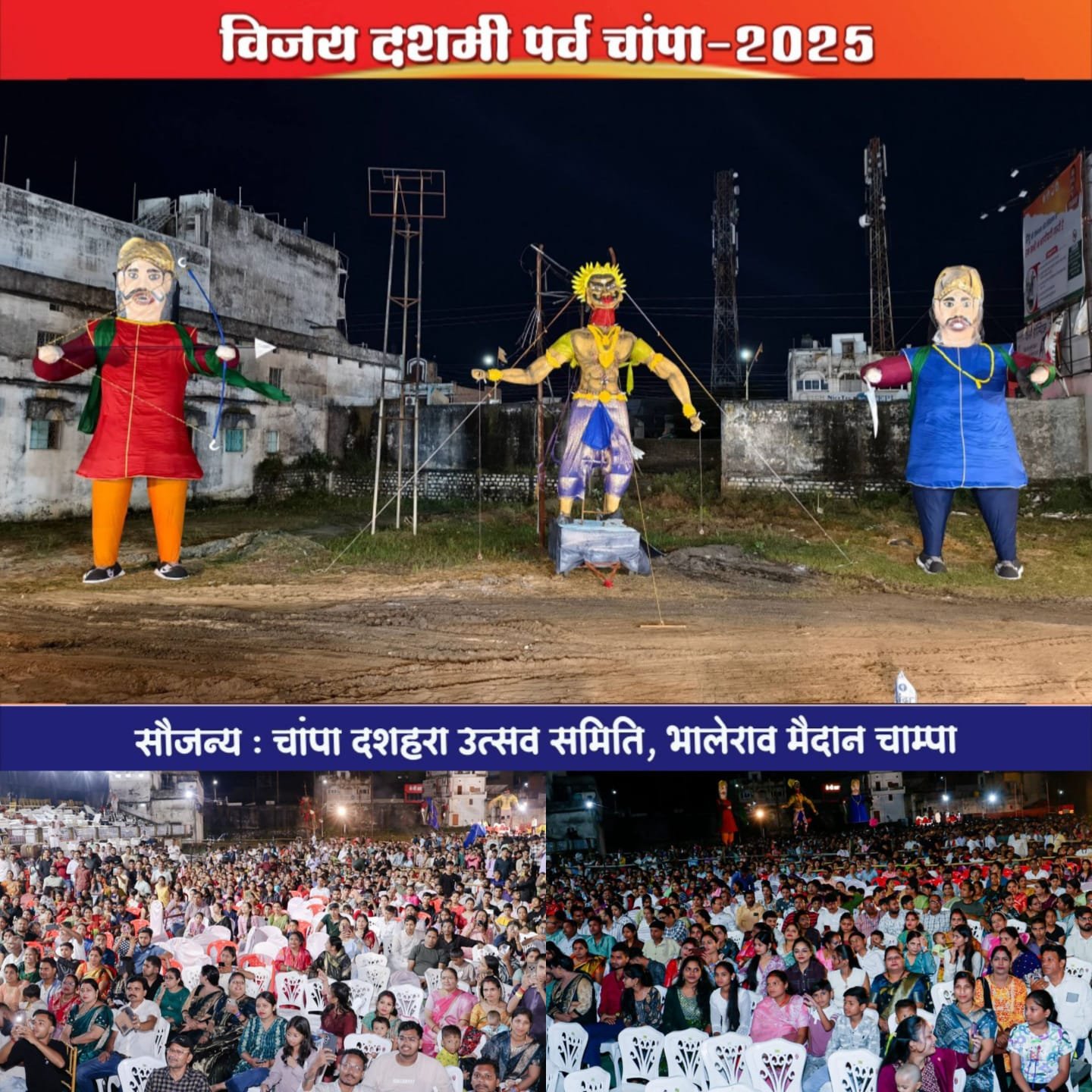 चांपा ! चाम्पा दशहरा उत्सव समिति भालेराय मैदान 2025 लाजवाब शानदार रहा जय जय श्री राम के नारों से चारों ओर गूंज रहा था भालेराय मैदान कार्यक्रम के बीच झमाझम बारिश भी शुरू हुई फिर भी लोगों की काफी भीड़ डटी रही शानदार आतिशबाजी होती रही बच्चों के साथ सभी बड़े उत्साह व उमंग से लुफ्त उठा रहे थे दशहरा का यह पर्व उत्साह और आस्था का उल्लास बुराई पर अच्छाई की जीत है लोगों की काफी मौजूदगी शानदार रही जय जय श्री राम, जय जय श्री राम !!