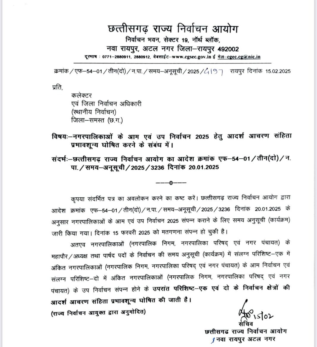 रायपुर। छत्तीसगढ़ में नगरपालिकाओं के महापौर, अध्यक्ष और पार्षद पदों के चुनाव और उप चुनाव 2025 के लिए राज्य निर्वाचन आयोग द्वारा 20 जनवरी 2025 को चुनाव कार्यक्रम जारी किया गया था. कार्यक्रम की घोषणा के साथ ही संबंधित नगरीय क्षेत्रों में आदर्श आचरण संहिता प्रभावी हो गई थी. प्रदेश के 173 नगरीय निकायों में 11 फरवरी को मतदान संपन्न हुआ. आज 15 फरवरी को मतगणना पूर्ण होने के बाद, राज्य निर्वाचन आयोग ने केवल नगरपालिकाओं के निर्वाचन क्षेत्रों में आदर्श आचरण संहिता को प्रभावशून्य घोषित कर दिया है.