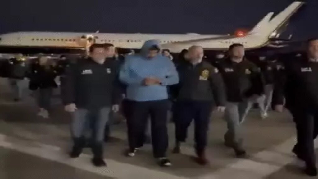मादुरो और उनकी पत्नी सिलिया को 4 जनवरी की आधी रात अमेरिका लाया गया। अमेरिकी सेना का विमान न्यूयॉर्क के स्टुअर्ट एयर नेशनल गार्ड बेस पर उतरा। कड़ी सुरक्षा के बीच मादुरो को प्लेन से उतारा गया। वे नीले रंग की जैकेट में थे, उनके हाथों में हथकड़ी थी। इस दौरान वे लंगड़ाते हुए दिखे।