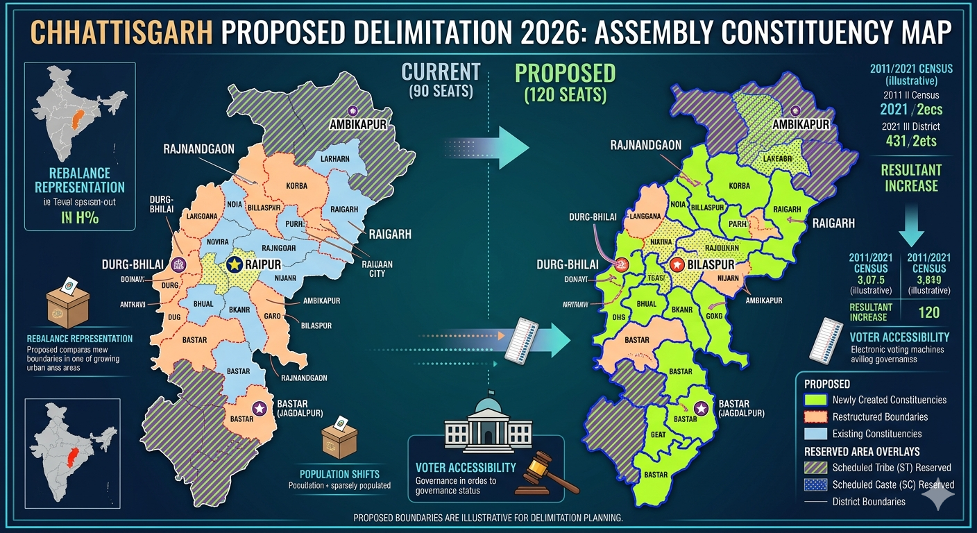 Delimitation 2026 : छत्तीसगढ़ में सियासी नक्शा बदलने की तैयारी, विधानसभा सीटें 120 तक बढ़ने के संकेत