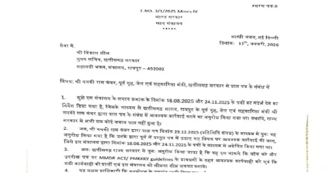 DMF Scam , कोरबा। डिस्ट्रिक्ट मिनरल फंड (DMF) के कथित दुरुपयोग के मामले में अब केंद्र सरकार ने सख्त रुख अपनाया है। प्रधानमंत्री कार्यालय (PMO) ने इस प्रकरण पर संज्ञान लेते हुए छत्तीसगढ़ के मुख्य सचिव विकास शील को स्मरण पत्र जारी किया है। यह कार्रवाई भाजपा के वरिष्ठ आदिवासी नेता एवं पूर्व गृहमंत्री ननकी राम कंवर द्वारा की गई शिकायत के बाद सामने आई है, जिससे राज्य की राजनीति और प्रशासनिक गलियारों में हलचल मच गई है।