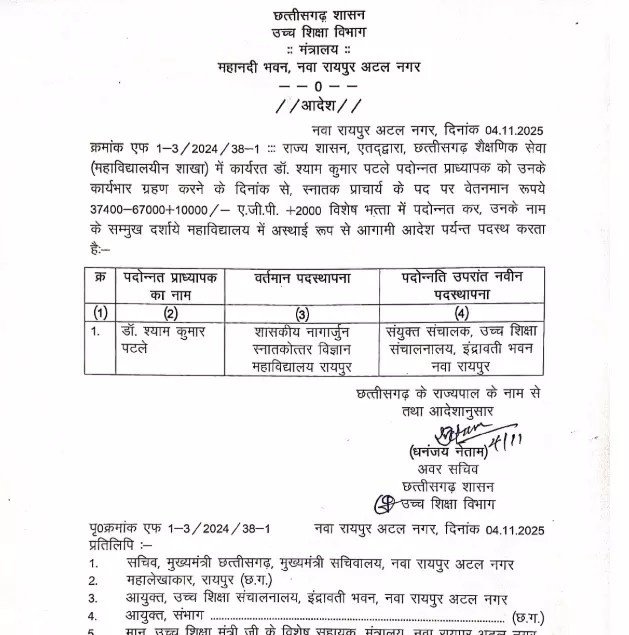 इस क्रम में, साइंस कॉलेज रायपुर के प्राध्यापक डॉ. अशोक कुमार पटले को किसी महाविद्यालय (कॉलेज) में प्राचार्य के रूप में पदस्थापित करने के बजाय, उन्हें उच्च शिक्षा संचालनालय में संयुक्त सचिव (Joint Secretary) के पद पर नियुक्त किया गया है। यह नियुक्ति ऐसे समय में हुई है जब विभाग में प्राचार्य संवर्ग की कमी को पूरा करने के लिए पदोन्नत अधिकारियों को कॉलेजों में भेजना प्राथमिकता होनी चाहिए थी।