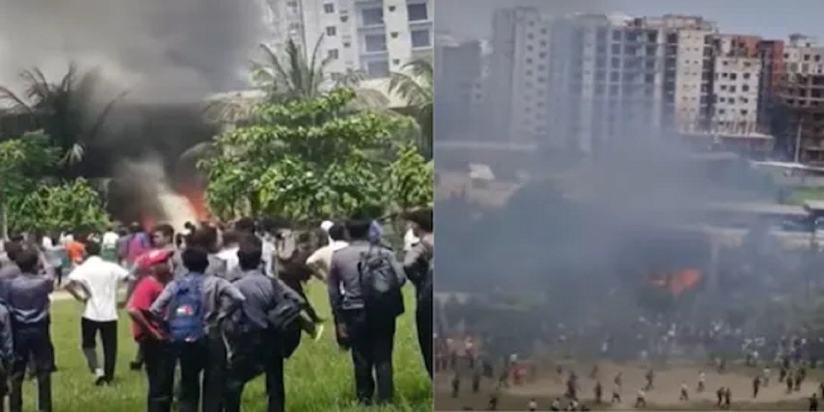 बांग्लादेश वायु सेना का एक प्रशिक्षण विमान (ट्रेनिंग एयरक्राफ्ट) सोमवार, 21 जुलाई की दोपहर लगभग 1.30 बजे क्रैश हो गया. यह F7 एयरक्राफ्ट था और यह ढाका के उत्तरी उत्तरा क्षेत्र में एक कॉलेज कैंपस में दुर्घटनाग्रस्त हो गया. एपी की रिपोर्ट के अनुसार हादसे में कम से कम 1 व्यक्ति की मौत हो गई और अन्य घायल हो गए.बांग्लादेश के प्रमुख बंगाली अखबार प्रोथोम अलो की रिपोर्ट के अनुसार चार घायल लोगों को वायु सेना के हेलीकॉप्टर द्वारा संयुक्त सैन्य अस्पताल (सीएमएच) ले जाया गया है.