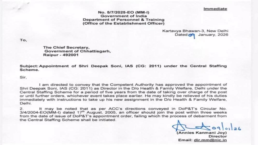 रायपुर। बलौदाबाजार-भाटापारा कलेक्टर दीपक सोनी को केंद्र सरकार में नई जिम्मेदारी दी गई है। उन्हें स्वास्थ्य एवं परिवार कल्याण मंत्रालय, दिल्ली में डायरेक्टर के पद पर नियुक्त किया गया है।
