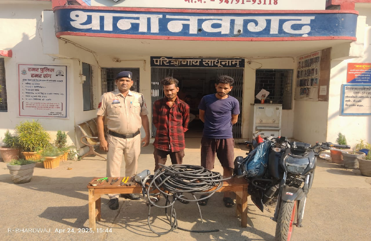कि सूचना थाना नवागढ़ पुलिस को मिलने पर त्वरित कार्रवाई करते हुए थाना प्रभारी नवागढ़ उप निरीक्षक पारस पटेल द्वारा तत्काल प्रकरण को गंभीरता से लेते हुए आरोपी 01.प्रवीण दास महंत उम्र 35 साल 02. सूरज चौहान उम्र 34 साल दोनो निवासी रामपुर कोरबा को पकड़ा जिसको हिरासत में लेकर घटना के संबंध में पूछताछ करने पर घटना घटित करना जुर्म स्वीकार किए जाने से चोरी का केबल तार और केबल काटने का सामन एवं चोरी में प्रयुक्त मोटर सायकल को बरामद किया जाकर आरोपियों को विधिवत दिनांक 24.04.25 को गिरफ्तार कर न्यायिक रिमांड पर भेजा गया है। उपरोक्त कार्यवाही मे उप निरीक्षक पारस पटेल थाना प्रभारी नवागढ़ एवं अन्य स्टाफ का सराहनीय योगदान रहा