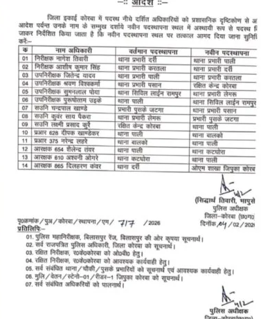 इसी क्रम में शहरी और संवेदनशील माने जाने वाले दर्री थाना में भी बदलाव किया गया है। यहां अनुभवी अधिकारी को थाना प्रभारी की जिम्मेदारी सौंपी गई है। माना जा रहा है कि क्षेत्र की संवेदनशीलता और बढ़ती राजनीतिक सक्रियता को देखते हुए यह निर्णय लिया गया है।
