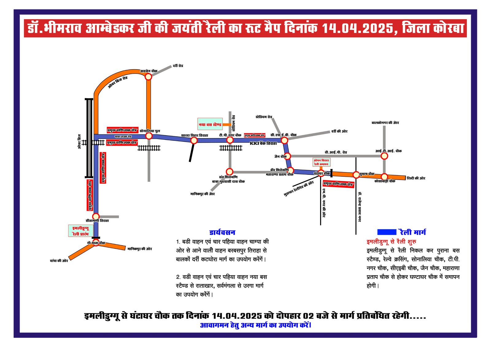 डॉ. भीमराव आंबेडकर जी की जयंती रैली हेतु रूट मैप Chhattisgarh April 14, 2025 34 Updated: April 14, 2025 By News Editor Share FacebookTwitterWhatsAppTelegram दिनांक 14 अप्रैल 2025 को डॉ. भीमराव आंबेडकर जी की जयंती के अवसर पर कोरबा जिले में एक रैली का आयोजन किया जा रहा है। यह रैली दोपहर 2:00 बजे इमलीडुग्गु से प्रारंभ होकर विभिन्न प्रमुख मार्गों से होती हुई घंटाघर चौक पर समाप्त होगी - Advertisement - Share FacebookTwitterWhatsAppTelegram Latest news Chhattisgarh इंटेंसिफाईड एचआईवी/एड्स सघन जागरूकता हेतु प्रचार रथ रवाना, करेंगे एचआईवी/एड्स के सम्बन्ध में जागरुक News Editor - January 28, 2026 - Advertisement - Chhattisgarh सुव्यवस्थित धान खरीदी व्यवस्था से किसान को मिला सुविधा और भरोसा News Editor - January 28, 2026 Chhattisgarh ट्रांसफार्मर के नाम पर घूसखोरी, कोरबा में असिस्टेंट इंजीनियर अरेस्ट News Editor - January 28, 2026 Chhattisgarh GGU परिसर में बवाल’ छात्रों और बाहरी युवकों में हिंसक झड़प, पत्थरबाजी का वीडियो वायरल News Editor - January 28, 2026 Related news Chhattisgarh इंटेंसिफाईड एचआईवी/एड्स सघन जागरूकता हेतु प्रचार रथ रवाना, करेंगे एचआईवी/एड्स के सम्बन्ध में जागरुक News Editor - January 28, 2026 Chhattisgarh सुव्यवस्थित धान खरीदी व्यवस्था से किसान को मिला सुविधा और भरोसा News Editor - January 28, 2026 Chhattisgarh ट्रांसफार्मर के नाम पर घूसखोरी, कोरबा में असिस्टेंट इंजीनियर अरेस्ट News Editor - January 28, 2026 Chhattisgarh GGU परिसर में बवाल’ छात्रों और बाहरी युवकों में हिंसक झड़प, पत्थरबाजी का वीडियो वायरल News Editor - January 28, 2026 - Advertisement -