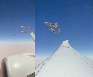पीएम मोदी सऊदी अरब के दौरे पर रवाना हो गए हैं। वहीं सऊदी अरब के एयर स्पेस में पीएम मोदी के विमान ने एंट्री ले ली है। इस मौके पर सऊदी अरब ने स्पेशल जेस्चर दिखा है। सऊदी अरब के एयर स्पेस में पीएम मोदी का विमान पहुंचने पर सऊदी अरब की एयर फोर्स ने उनके विमान को स्पेशल सुरक्षा प्रदान की। इसका वीडियो भी सामने आया है, जिसमें पीएम मोदी के विमान के साथ सऊदी अरब की एयर फोर्स के विमान (F15s of the Royal Saudi Air Force) भी उड़ान भरते हुए दिखाई दे रहे हैं।