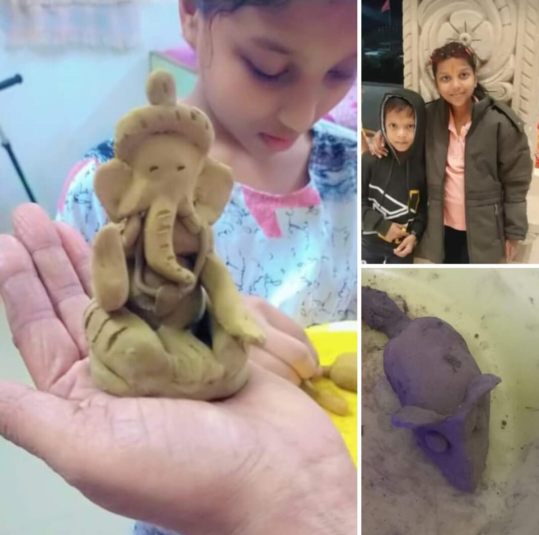 पर्यावरण संरक्षण का संदेश देने नन्हे नन्हे हाथों से बनाते हुए (इको फ्रेंडली हैंडमेड) मिट्टी के गणेश जी