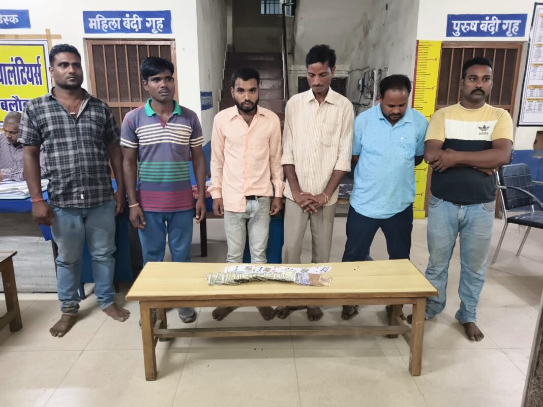 (1) शिव कुमार भारद्वाज उम्र 36 वर्ष ग्राम पचरी थाना अकलतरा (2) राहुल दिवाकर उम्र 21 वर्ष ग्राम बालपुर थाना चांपा (3) विजय कुमार उम्र 42 वर्ष ग्राम बुचीहरदी (4) पलटन रात्रे उम्र 35 वर्ष ग्राम बुचीहरदी (5) रामानुज सुमन उम्र 32 वर्ष ग्राम बुचीहरदी (6) योगेश उर्फ पप्पु खुंटे उम्र 32 वर्ष ग्राम भिलाई थाना बलौदा को काट पत्ती नामक जुआ खेलते पकडा गया जिनके कब्जे से 15090/ रूपये नगदी, 52 पत्ती तास बरामद किया जाकर आरोपियों का कृत्य धारा 3 (2) छ. ग. जुआ प्रतिषेध अधिनियम 2022 का घटित करना सबूत पाए जाने से विधिवत गिरफ्तारी कार्यवाही किया गया है।