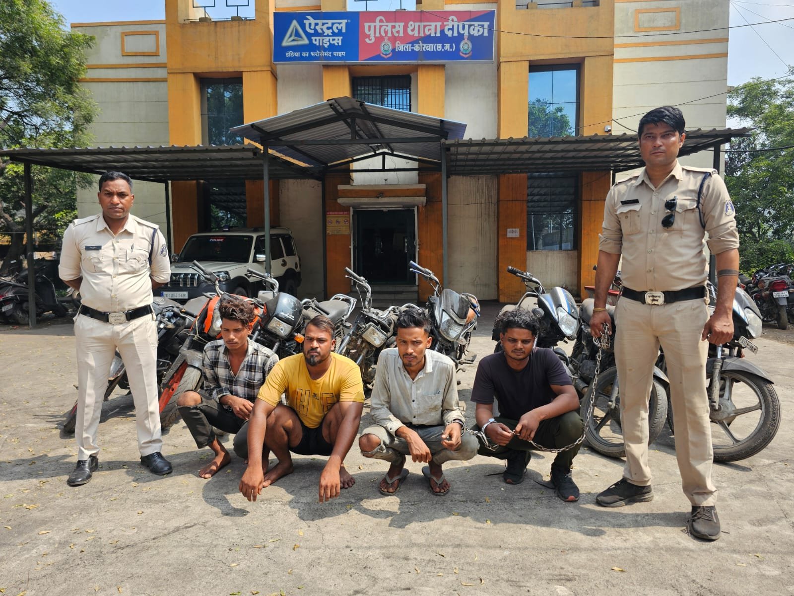 मामले का संक्षिप्त विवरण इस प्रकार है कि पुलिस अधीक्षक महोदय कोरबा श्री सिद्धार्थ तिवारी (भा.पु.से.) द्वारा अवैध गतिविधियों एवं असामाजिक तत्वों के विरुद्ध कठोर कार्यवाही करने के निर्देश सभी थाना प्रभारियों को दिया गया है, उक्त निर्देश पर अतिरिक्त पुलिस अधीक्षक श्री यूबीएस चौहान, नगर पुलिस अधीक्षक कोरबा रविन्द्र कुमार मीना (भा.पु.से.) और नगर पुलिस अधीक्षक श्रीमती प्रतिभा मरकाम के मार्गदर्शन में थाना/चौकी प्रभारियों के नेतृत्व में मोटरसाइकिल चोरी करने वाले अंतर्राज्यीय गिरोह को पकड़ने में सफलता प्राप्त हुई है। प्रार्थियों की रिपोर्ट पर थाना दीपका, बालको, चौकी सीएसईबी व चौकी मानिकपुर में रिपोर्ट दर्ज कराया गया था कि जिले के विभिन्न स्थानों से मोटर सायकल की अज्ञात व्यक्तियों के द्वारा चोरी कर लिया गया था जिस पर संबंधित थाना/चौकी में अपराध पंजीबद्ध कर वरिष्ठ अधिकारियों के मार्गदर्शन में तत्काल थाना बालको, थाना दीपका, चौकी सीएसईबी एवं चौकी मानिकपुर के द्वारा टीम गठित कर मोटरसाइकिल चोरी करने वाले अंतर्राज्यीय गिरोह के कुल 18 आरोपी एवं 04 अपचारी बालक को पकड़कर उनके कब्जे से चोरी किए गए विभिन्न माडल जैसे बूलेट, होण्डा एक्टिवा, स्पलेंडर, डिलक्स एवं अन्य कंपीनियों के कुल 21 नग मोटर सायकल एवं घरेलू सामान के साथ उड़ीसा पासिंग नंबर प्लेट को जप्त किया गया।