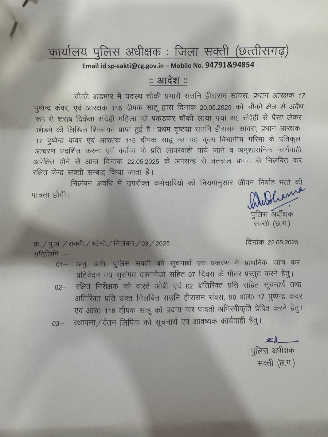 जिला सक्ती में पुलिस अधीक्षक सुश्री अंकिता शर्मा के द्वारा विभागीय अनुशासन एवं कर्तव्य के प्रति कठोरता बरतते हुए तीन पुलिसकर्मियों को तत्काल प्रभाव से निलंबित किया गया है।