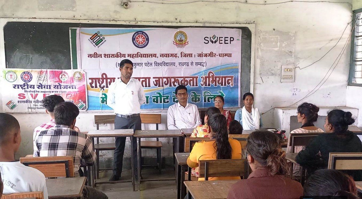 जांजगीर-चांपा 09 जुलाई 2025/ कलेक्टर एवं जिला निर्वाचन अधिकारी श्री जन्मेजय महोबे के निर्देशन में नवीन शासकीय महाविद्यालय नवागढ़ में मतदाता जागरूकता कार्यक्रम का आयोजन किया गया। कार्यक्रम का उद्देश्य युवा मतदाताओं को अपने मताधिकार का निष्पक्ष एवं निर्भीक होकर प्रयोग करने तथा लोकतंत्र में अपने सक्रिय सहभागिता के लिए प्रेरित करना था।