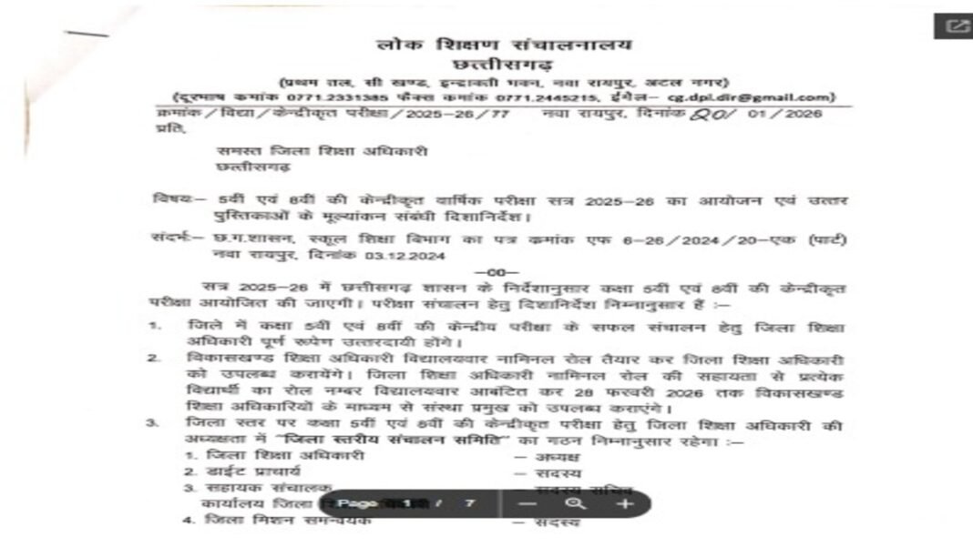 रायपुर। सत्र 2025-26 में छत्तीसगढ़ शासन के निर्देशानुसार कक्षा 5वीं एवं 8वीं की केन्द्रीकृत परीक्षा आयोजित की जाएगी। परीक्षा के सफल संचालन और उत्तर पुस्तिकाओं के मूल्यांकन को लेकर लोक शिक्षण संचालनालय (DPI) ने विस्तृत दिशा-निर्देश जारी किए हैं। जारी गाइडलाइन के अनुसार, जिले में परीक्षा संचालन की पूर्ण जिम्मेदारी जिला शिक्षा अधिकारी (DEO) की होगी।