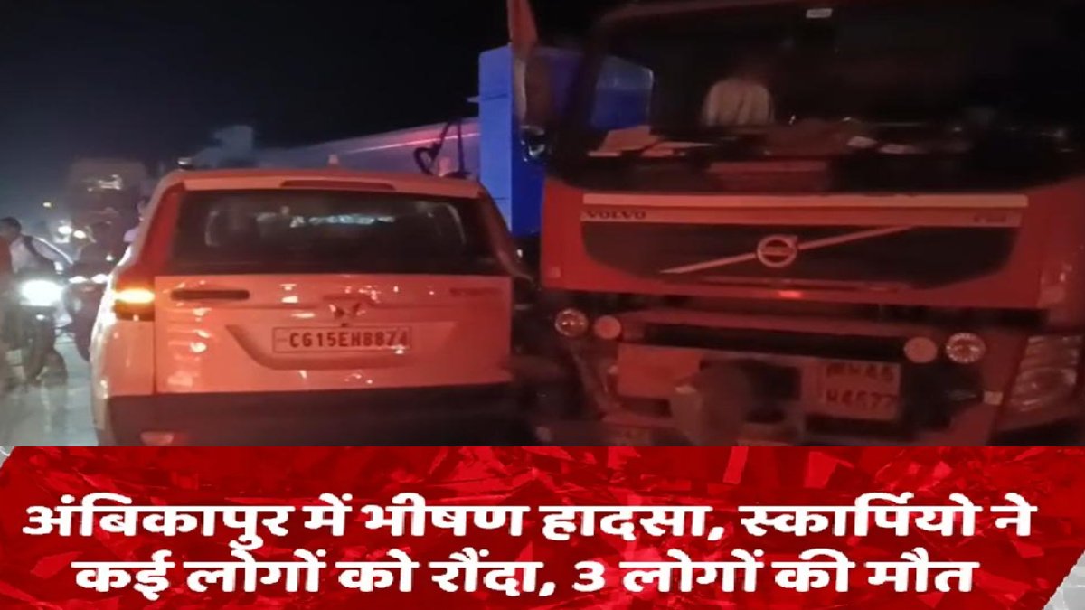 अंबिकापुर | 06 अप्रैल, 2026 छत्तीसगढ़ के सरगुजा जिले में रविवार की रात एक भीषण सड़क हादसे ने पूरे इलाके को दहला दिया। NH-130 ‘ पर स्थित मणिपुर थाना क्षेत्र के भिठ्ठीकला गांव के पास एक तेज रफ्तार स्कॉर्पियो ने सड़क पार कर रही चार महिलाओं को बुरी तरह कुचल दिया। हादसे की भयावहता का अंदाजा इसी बात से लगाया जा सकता है कि तीन महिलाओं ने मौके पर ही दम तोड़ दिया, जबकि एक अन्य महिला गंभीर रूप से घायल है।